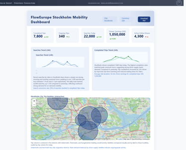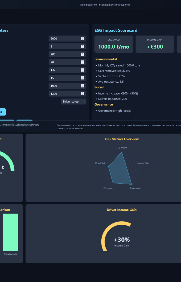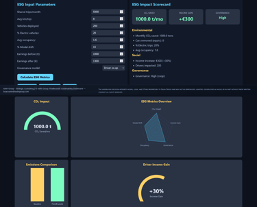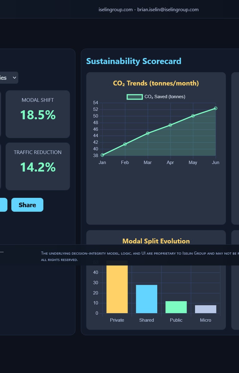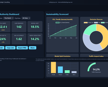 Sustainability metrics (CO₂, modal shift, electrification) ready for climate reporting and funding bids.